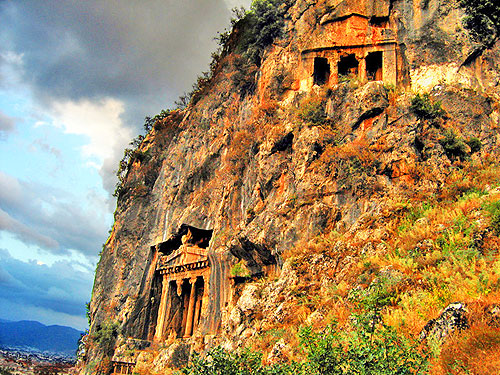 Мира Ливийская – древний город (современное название - Демре), затерявшийся между эпохами и народами, некогда населявшими эту землю. Сама Мира была основана примерно в V веке до н.э., и одной из достопримечательностей города являются знаменитые скальные захоронения - высеченные в скале гробницы древних ливийцев. Находятся они на отвесном срезе скалы, которая буквально испещрена этими «пещерами». У ликийцев существовал обычай хоронить мертвых на возвышенных местах, так как предполагалось, что это поможет им попасть на небо. Каждая гробница с внешней стороны пышно украшалась барельефами и резьбой, по которым можно определить, - чем занимался усопший при жизни…